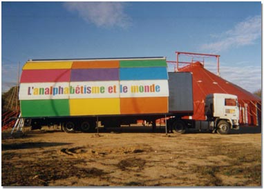 Un semi-remorque dépliable à transformer, une carte du monde plombée au-dessus des têtes en guise de tableaux noirs.